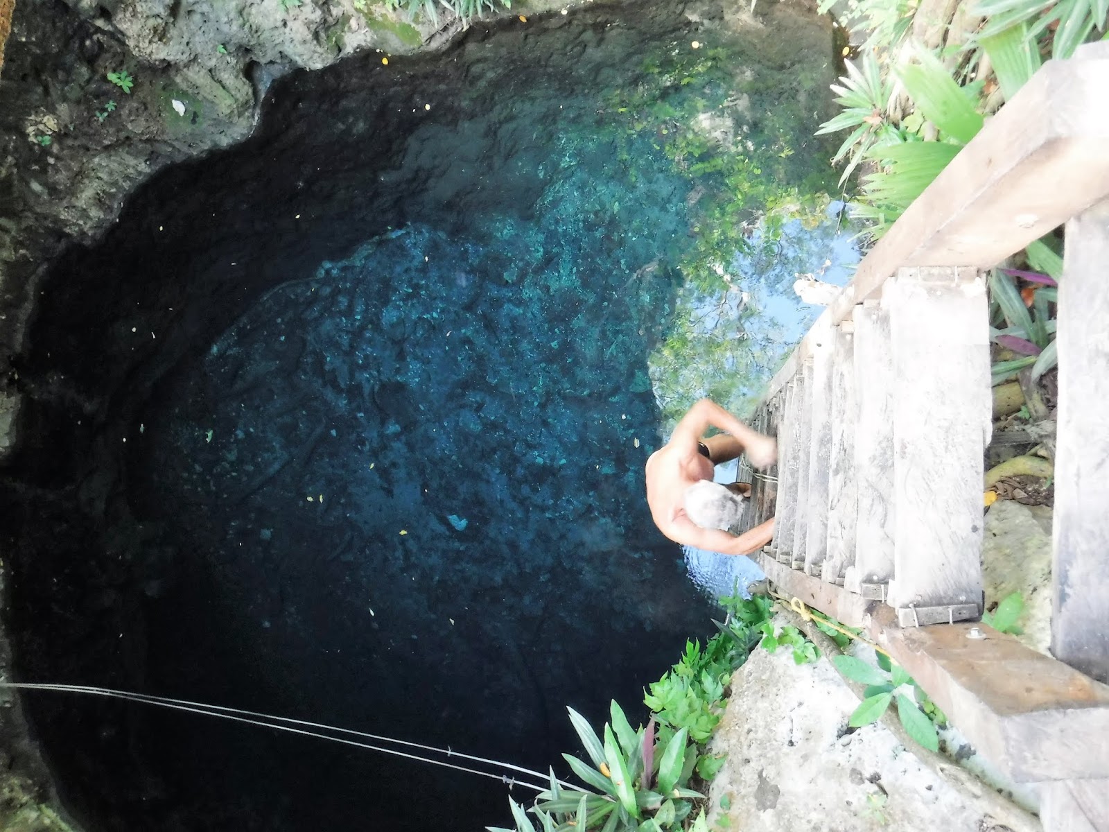 Notre guide nous rassure, car parfois le trou est profond et l'eau, bien qu'éclairée par une lumière naturelle on en voit pas le fond ........je ne suis pas descendu dans un car l'échelle était trop raide .